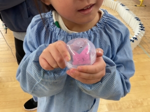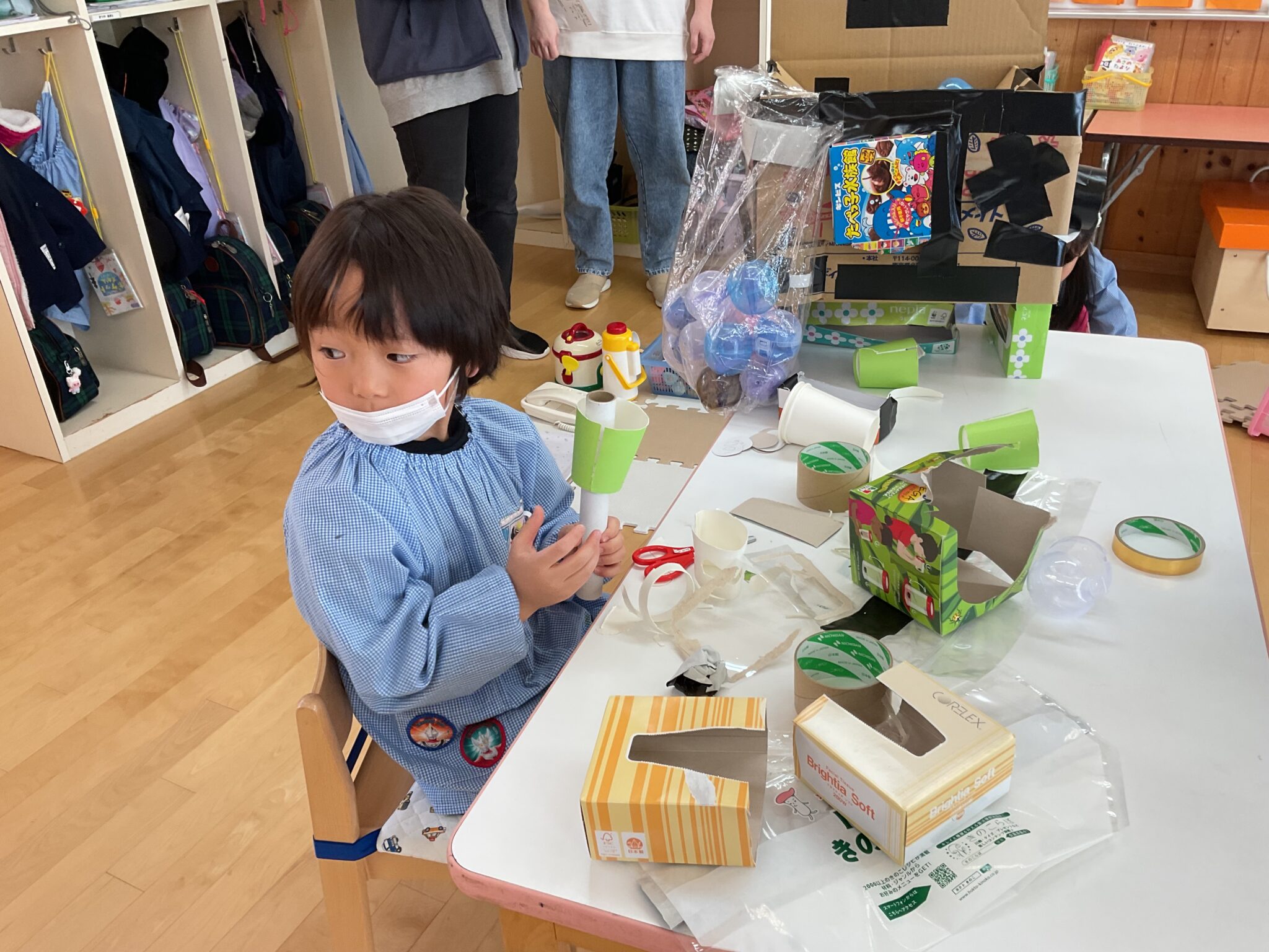 おもちゃは折り紙で作ったウサギや、綿を入れてふわふわにしたスクイーズなど、工夫がいっぱい✨考えて作った作品は、みんなの力になるね。