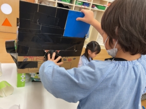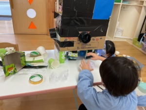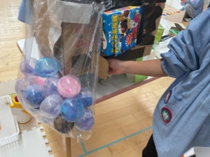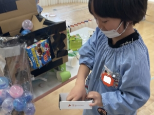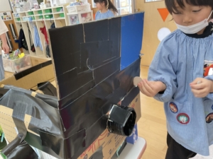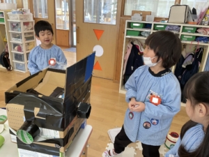 12月に小学校との交流で、小学生手作りのおもちゃで遊んだ年長さん。自分たちで、廃品を使っておもちゃ作りをすることが増えていました。おひさまぐみでカプセルトイが完成✨ まずはここにお金を入れるよ。コインも厚紙を切って作っていました。 箱の横には、何やら仕掛けが… 入れたお金は、ここを開いて この箱に入るよ。 ここを回すと… カプセルに入ったおもちゃが出てきました!