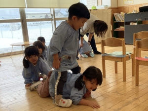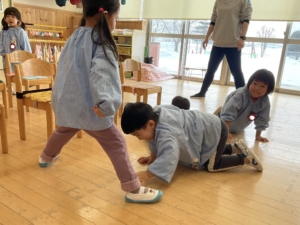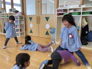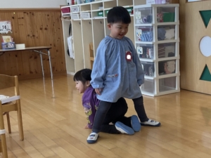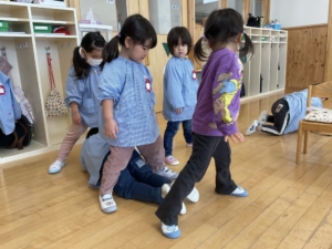 おしり歩きをしたり、お友達の脚トンネルをくぐって大盛り上がり!