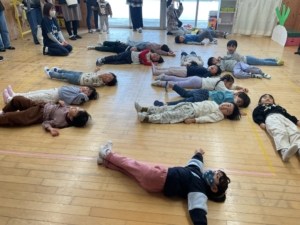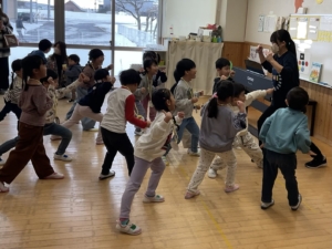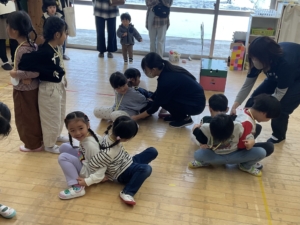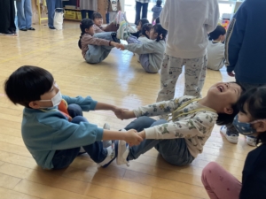 まずはカブを抜くパワーを貯めよう。みんなで力を合わせることが大切だよ✨ うんとこしょ、どっこいしょ! 大きなカブが、抜けた〜! 今度は猪俣先生との勝負だ! ゴロゴロゴロゴロ…ドカン!大丈夫?おへそは食べられなかったかな。