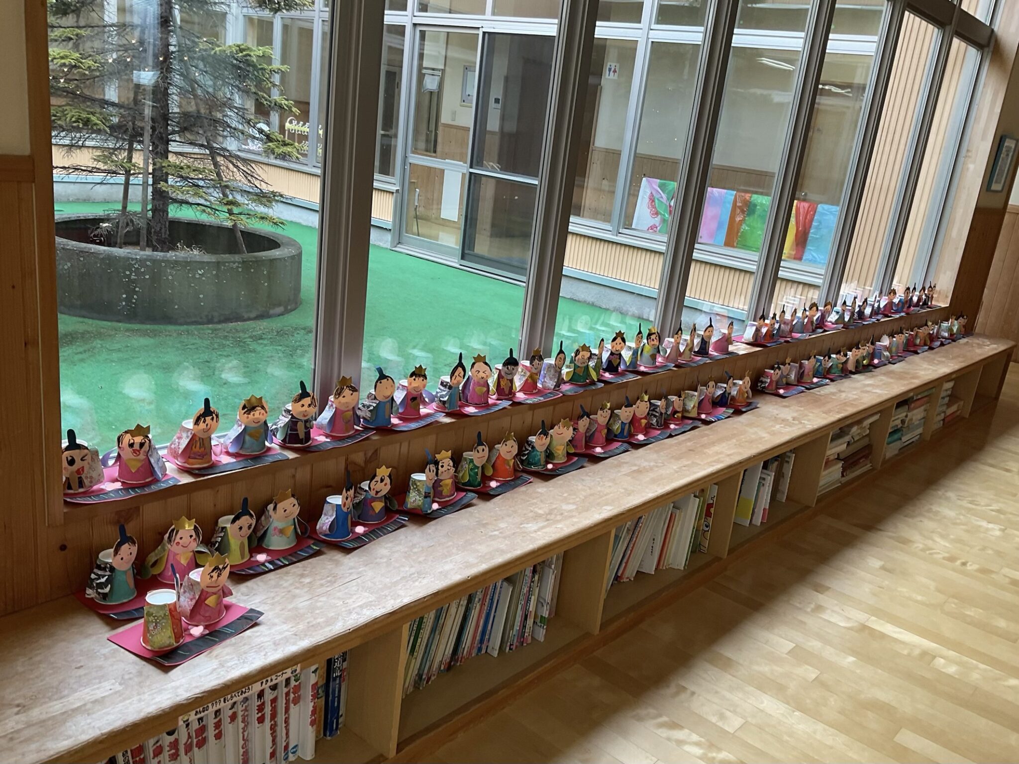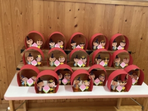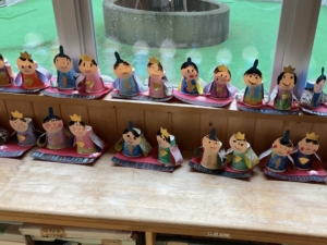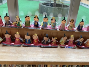 ひな祭りに向けた製作が完成し、廊下や多目的コーナーに飾られました。