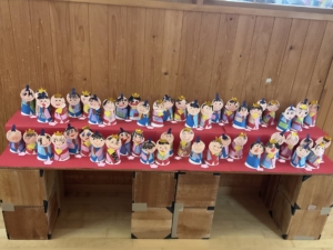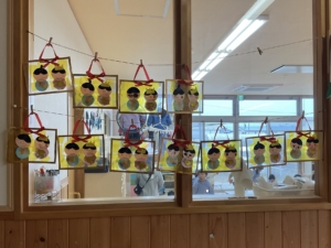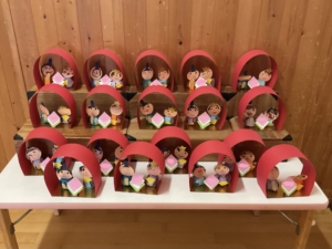 年中さんは輪を組み合わせて体を作り、ドーム型のおうちに入っています。 はなぐみは色紙や千代紙をハサミで切り、着物の模様にしました。 ことりぐみは千代紙をのりで貼ったり、ステンドグラス風の金屏風にしましたよ。みんなとてもきれいで可愛い、素敵なお雛様ができました。