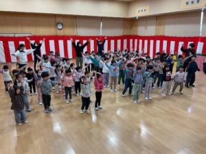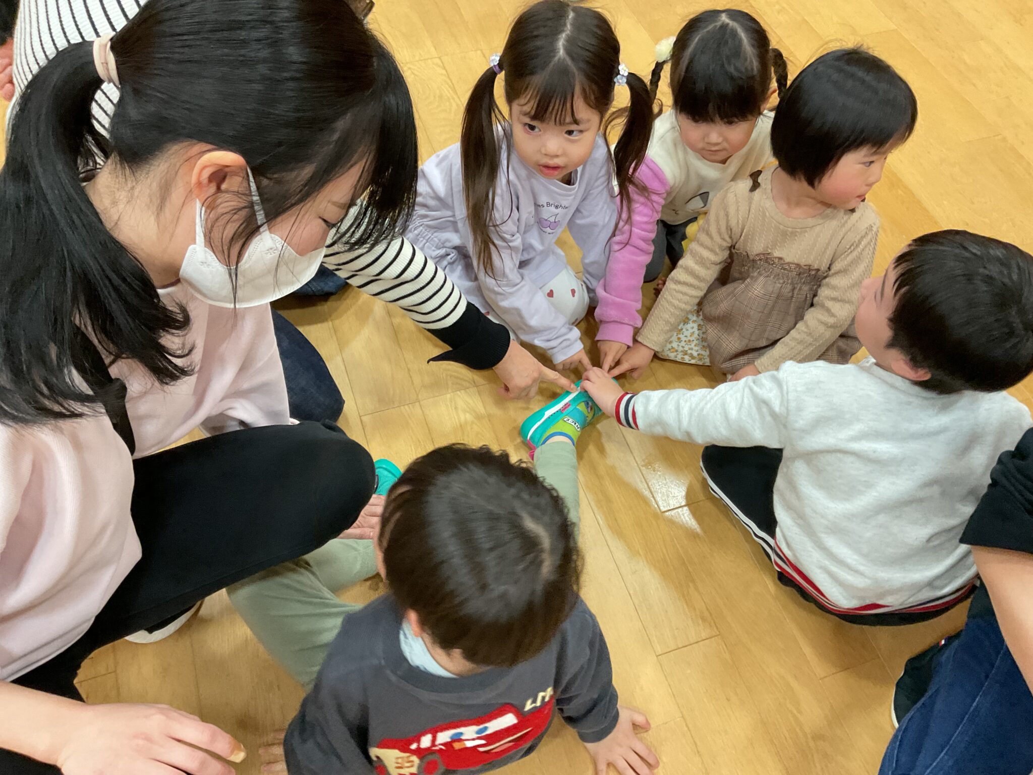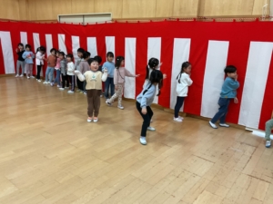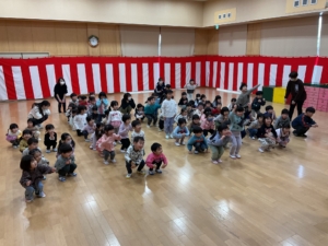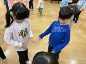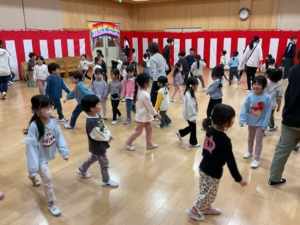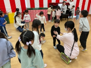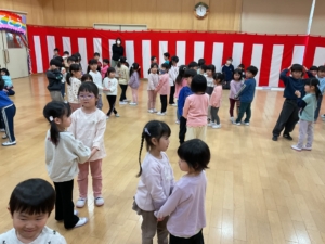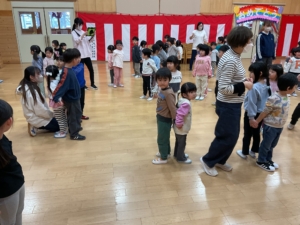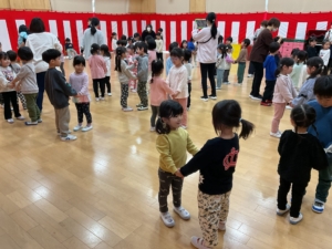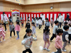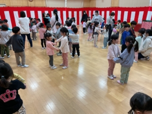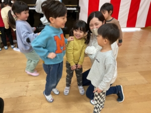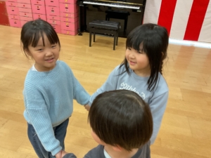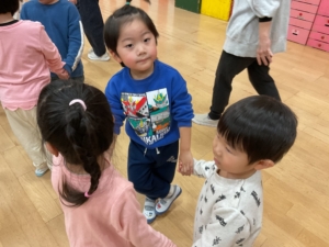 幼稚園には預かり保育利用の年長さんもいました。みんなでお遊戯室に集まって、色探しやなべなべ底抜け、ジャングルぐるぐるをして楽しみました。