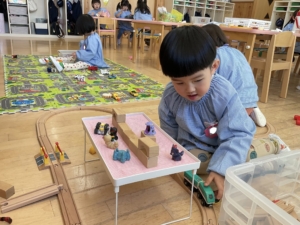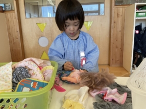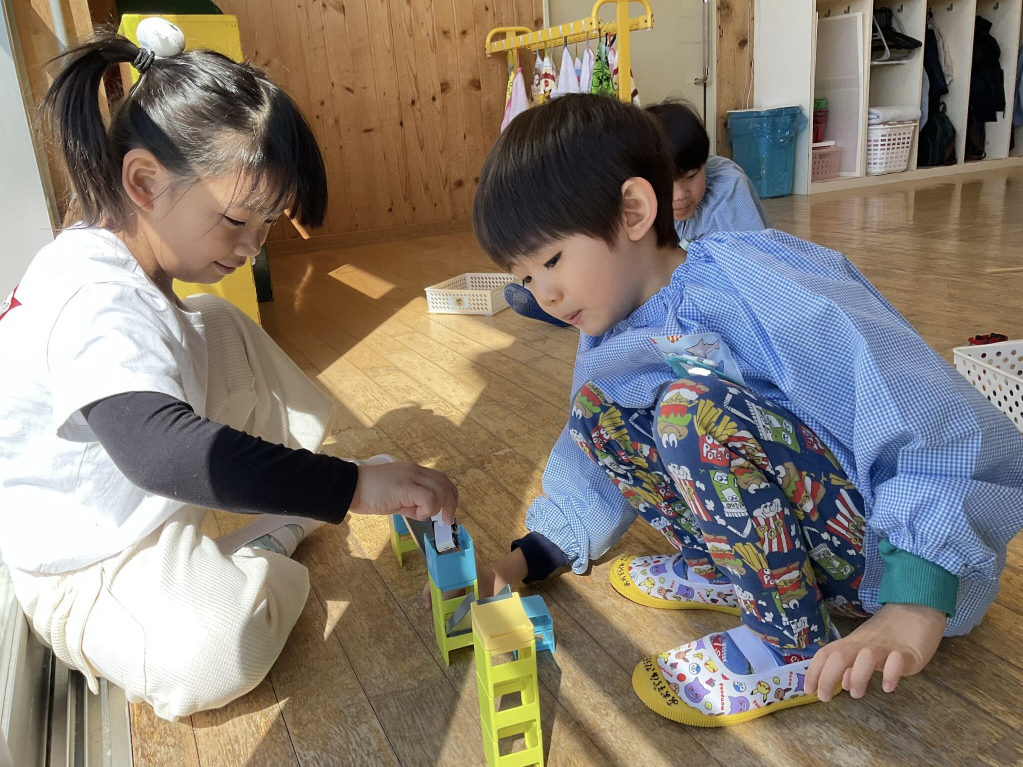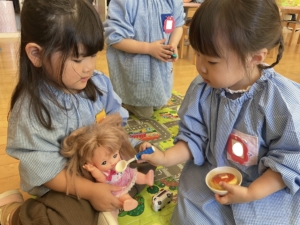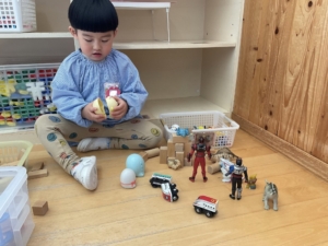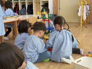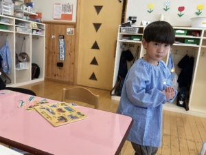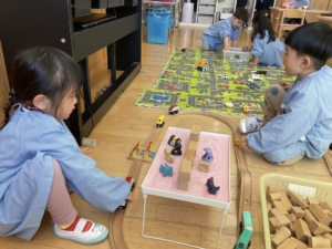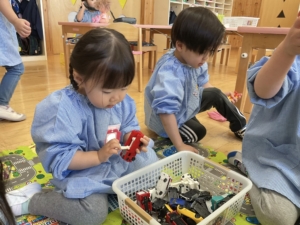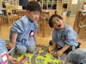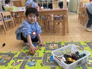 新しいお友達が、お家の人から離れて初めて登園しました。ドキドキしてるかな、楽しみにしていた遊びはあるかな、困ったことは言えるかな、お家の方も不安でいっぱいだったのではないでしょうか。