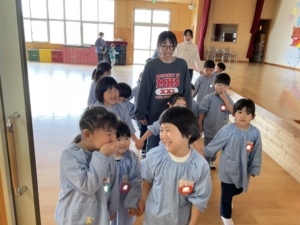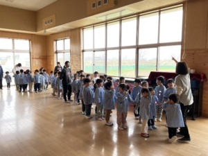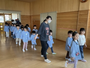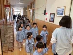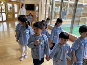 お部屋で楽しく遊んだあとは、幼稚園の中を探検しよう! 今日はおひさまぐみ、あおぞらぐみ、はなぐみのみんなで幼稚園の中を歩きました。