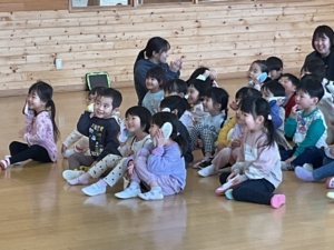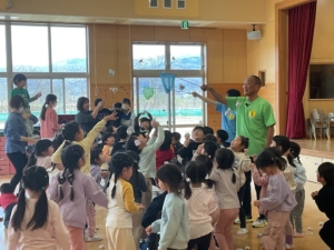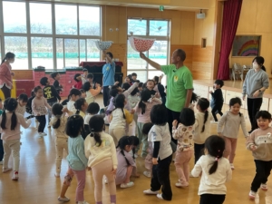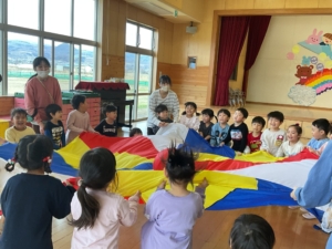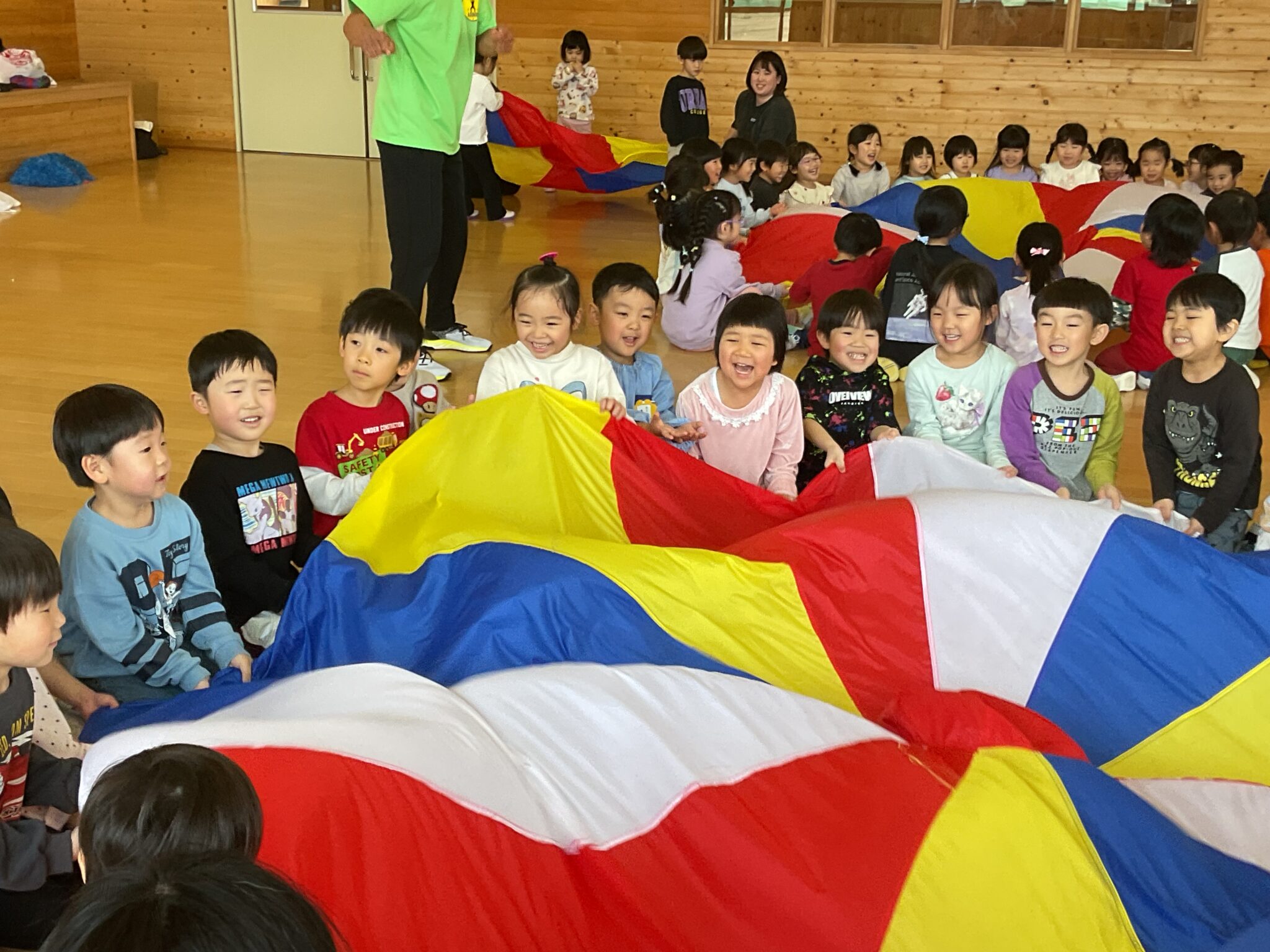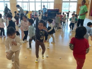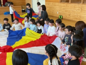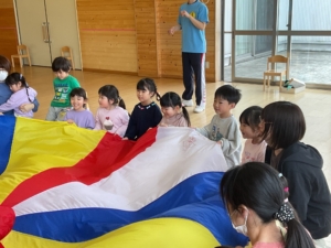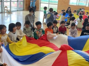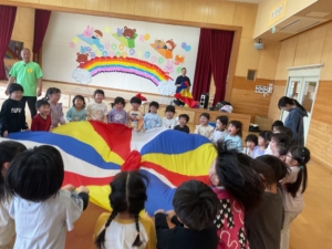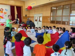 バルーンを使って、みんなで真ん中の穴にタコさんや亀さん、ポンポンを入れるゲームもしました。みんな大盛り上がりで、たっぷり遊んだ1時間でした。
