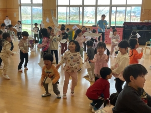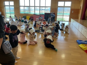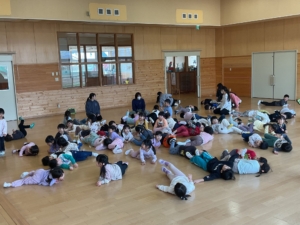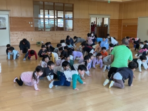 お遊戯室いっぱいに広がって、沢井先生と競争だ〜