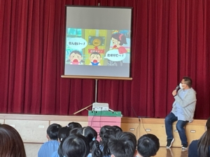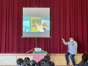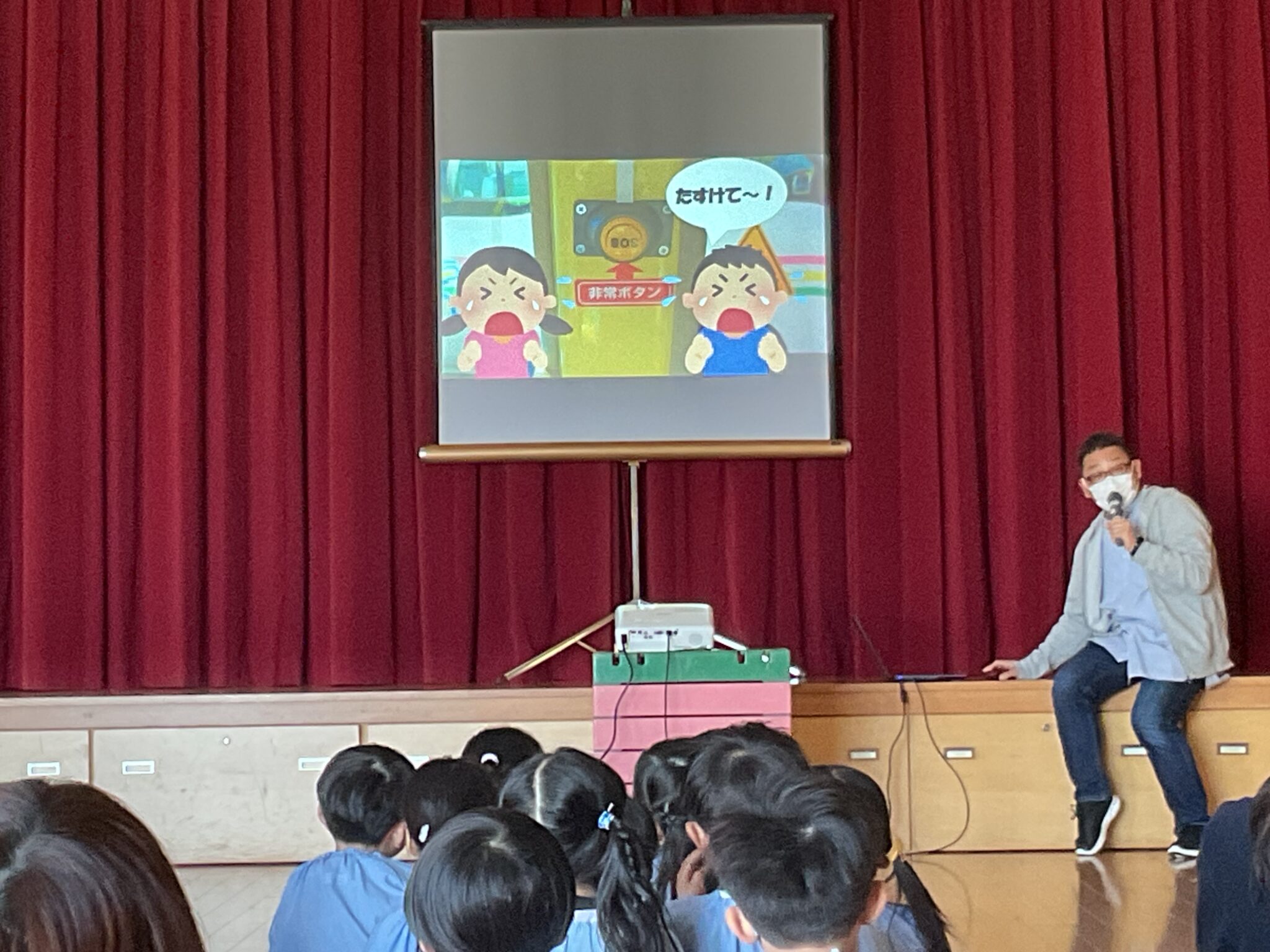もしもの時に子ども達を守るため、バスの入り口のSOSボタンがどうしてあるのかお話ししました。