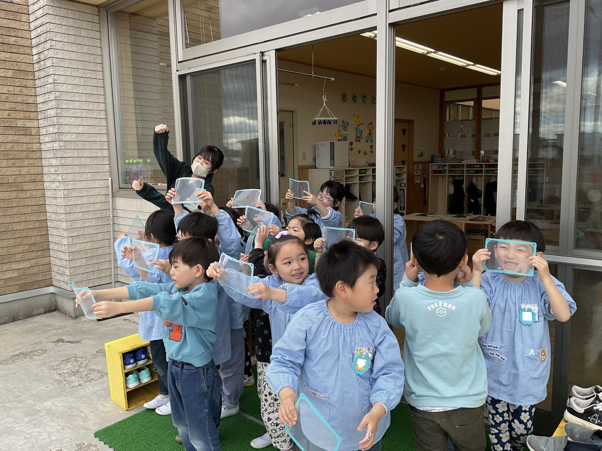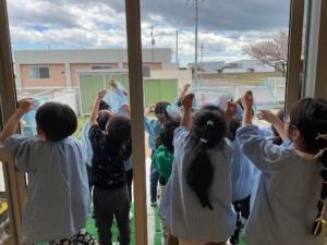 あおぞらぐみさんが何やらカードを空にかざしていました。 光が当たるとカードに虹が現れるんだって!綺麗に見える角度を夢中で探していました。