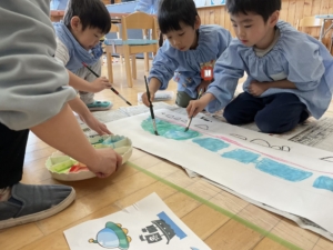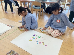 おひさまぐみさんは絵の具やクレパスを使って何やらお絵描き中…… これは先日みんなで決めた『誕生表』に使うものです。 紙が大きいから一人で描くのは大変だね、みんなで力を合わせよう! 完成したら改めてお知らせしますね✨
