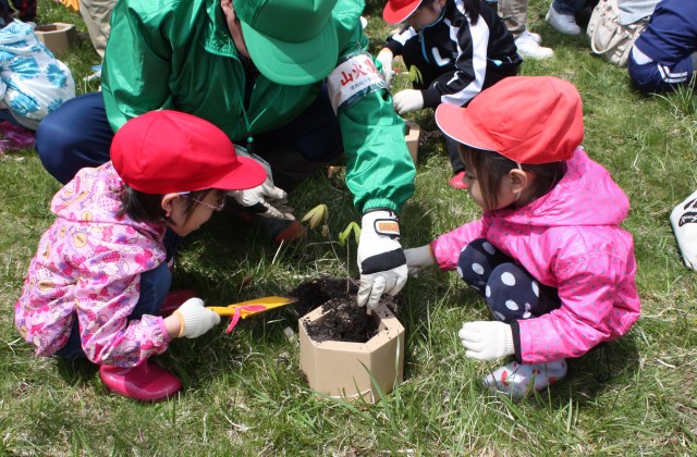 北斗市合併10周年、北海道新幹線開業記念として、北海道森づくりフェスタ2016が 北斗市きじひき高原で開かれました。 年長さんの参加希望者で、どんぐりの植樹をしてきました。 やさしく土をかけてね。おおきくなぁれ。 10年後、20年後、どんぐりはどんな木に成長しているかな。