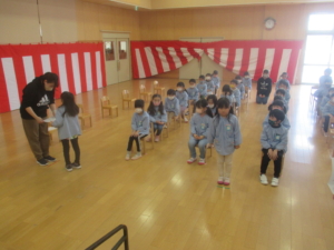 今日はにじぐみさんが見学に。 来年は自分たちが卒園式。 大きいくみさんが頑張っている姿を見て、 4月から自分たちが幼稚園で一番おにいさんおねえさんになることを 自覚していました。
